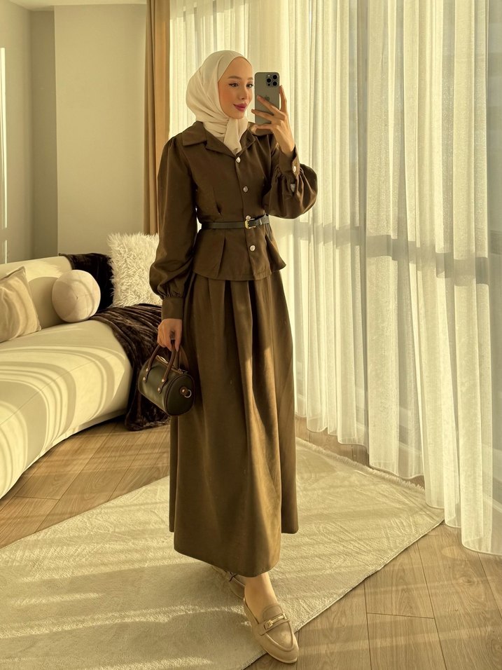 Haki renginde, süet kumaştan yapılmış, kemerli ve uzun kollu, notched lapel yakalı takım. Günlük sokak stiline uygun, mütevazı Paris tarzı ve regular fit.