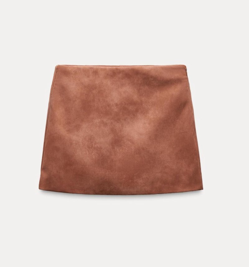 Süet görünümlü, parlak görünümlü ve vücuda oturan mini etek, günlük kullanıma uygun minimalist ve çağdaş tarzda.