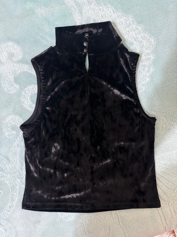 Siyah süet malzemeden yapılmış, yüksek yakalı ve düğmeli, gotik tarzda, kolsuz ve normal midi uzunlukta dar kesim kadın bluz