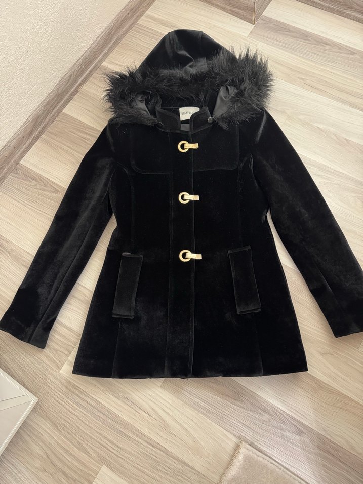 Çok tarz ve kaliteli siyah süet kaban. Ön kısmında altın tonlu tokalar, kapüşon kenarında yumuşak ve dolgun suni kürk detayı bulunuyor. Soğuk havalarda hem sıcak tutuyor hem de şık bir görünüm sağlıyor. Kürklü kapüşonu çıkarılabilir.Az kullanılmış, tertemiz, hiçbir yıpranma yok.Özel günler için idealdir.