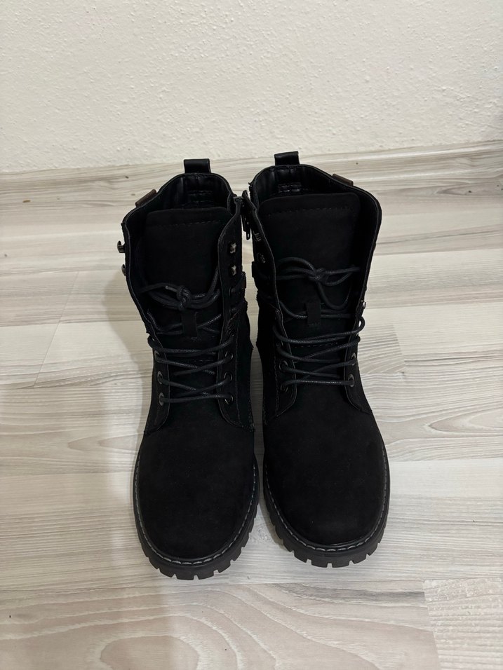 Siyah süet malzemeden, bağcıklı tasarıma sahip kadın botları. Goth tarzını günlük kullanım için sunar. 40 numara Deichmann süet kadın bot Yeni Sıfırdır