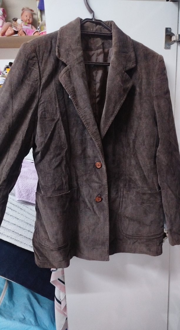 Düğmeli kahverengi süet blazer ceketi, kesik yaka ve uzun kolludur. Midi boyu ve regular fit kesimiyle ofis için uygundur, vintage tarzı yansıtır.