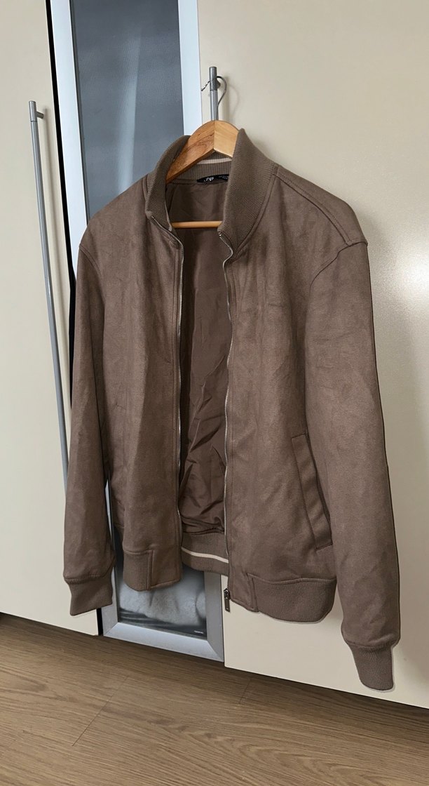 Yumuşak süet kumaştan, kahverengi renkte, fermuarlı ve normal kesim uzun kollu erkek ceket. Notlu yaka tasarımıyla günlük kullanıma uygundur.
