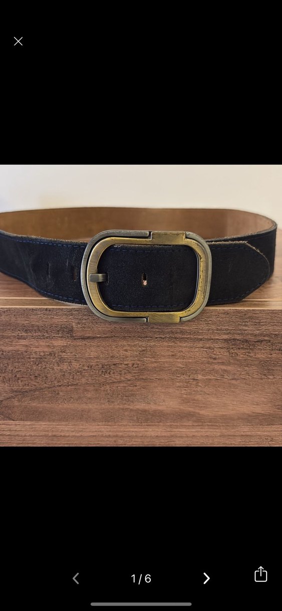 Siyah süet malzemeden yapılmış, büyük dikdörtgen tokalı kemeri, vintage karşı kültür tarzını yansıtıyor.