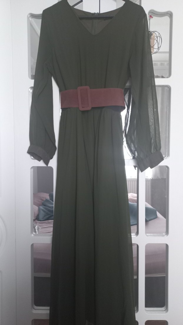 Haki rengiuzun elbise, V yaka ve bol kesim ile kahverengi bel kemeri ve uzun tül kollara sahiptir. Kemer kısmına lastik dikimi gerçekleştirildi, daha rahat giyilebilmesi için. Elbiseyi 2 defa giydim, o yüzden yeni gibi diyebilirim. Kumaş Türü: Şifon Ürün kemerli ve astarlı olarak tasarlanmıştır.