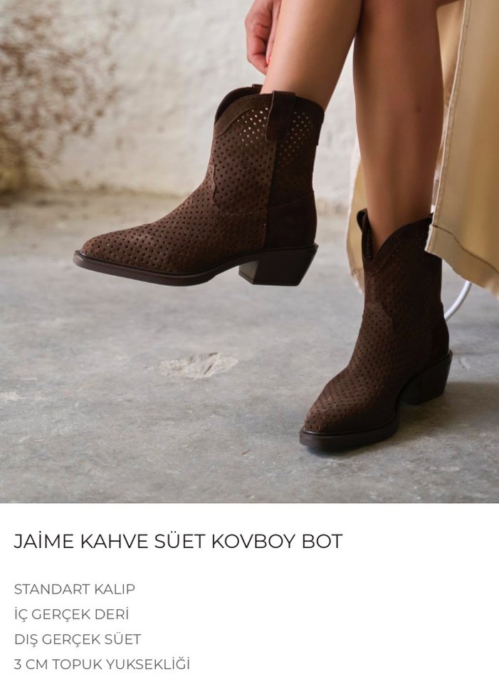 3 cm topuklu, içi gerçek deri, dışı süet kahverengi kovboy bot. Yılan desenli, bağcıklı, modern ve rahat tarzda günlük kullanıma uygun.