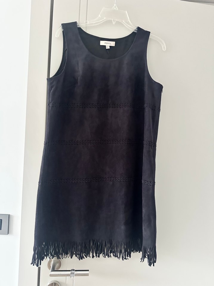 Lacivert süet kumaştan, kolsuz ve yuvarlak yakalı, mini boyda, oturan kesim elbise. Püskül detayları ve örgü dikişli tasarımıyla günlük ve gece kullanıma uygun.
