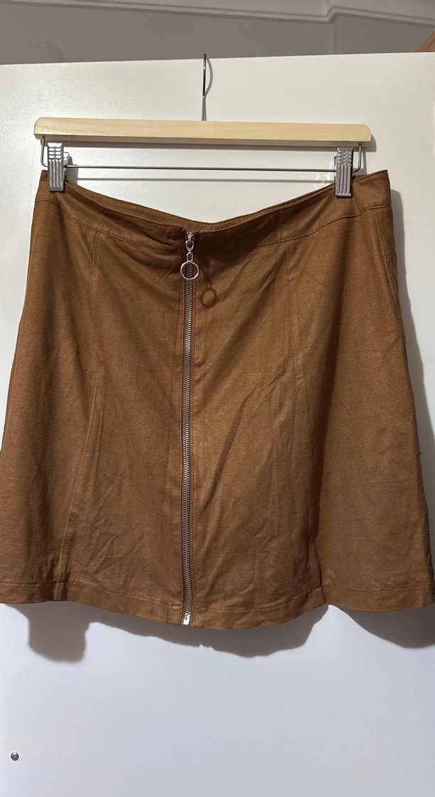 Önden fermuarlı, bol kesim kahverengi süet midi etek. Parlak dokusu günlük ve bohem tarzlar için uygundur. ✨
