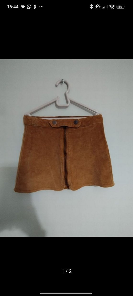 Yumuşak süet kumaştan yapılmış kahverengi, düğmeli ve vücuda oturan mini etek, parlak yüzeyiyle retro sokak stili sunar. ✨