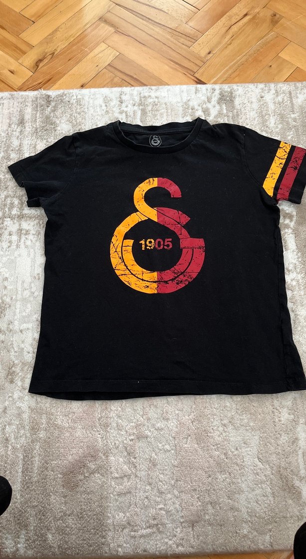 Süet kumaştan yapılmış siyah erkek çocuk tişörtü, kısa kollu ve yuvarlak yakalıdır. Üzerinde "1905" sayısı ve kolunda renkli çizgiler bulunan baskılı tasarıma sahiptir.