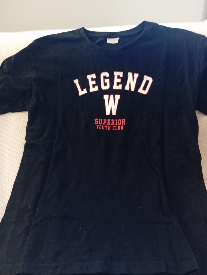 Siyah süet kumaştan, kısa kollu ve bol kesim erkek çocuk tişörtü. Önünde "LEGEND W SUPERIOR YOUTH CLUB" baskısı gögüs altından 40 cm boy 56 cm 10/11 yaş yeni gibi