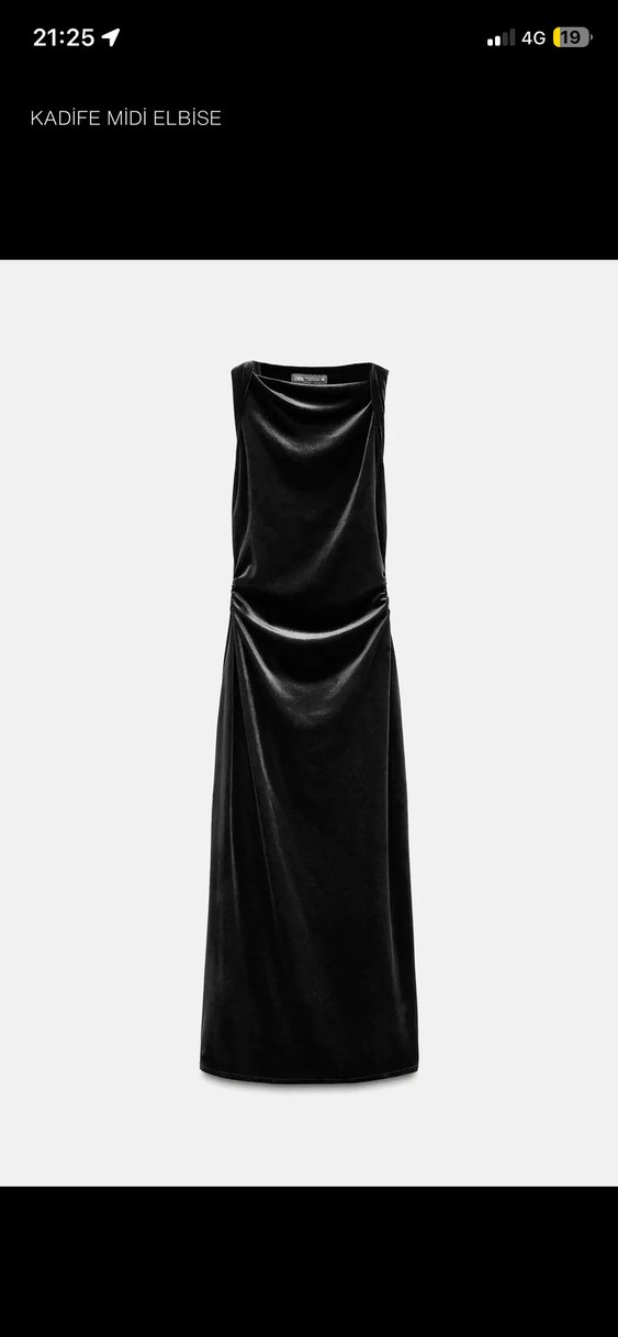 Drapeli detaylara sahip, kolsuz, tek parça süet kumaştan yapılmış, siyah uzun ve dar kesim elbise. Minimalist gotik tarzı için uygun.