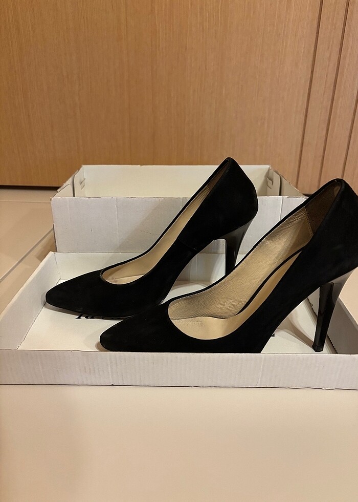 37 numara, siyah süet stiletto Oi Arte marka ayakkabı. Topuğu 10 cm’dir. Kalıbı biraz dardır. 36 numaralıların bir numara büyük olarak tercih edebileceği bir kalıp. Sol tekinin iç topuğunda hafif bir kalkma mevcuttur, yapıştırılabilir. Kutusu mevcuttur