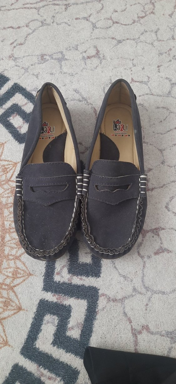 Mavi süet malzemeden yapılmış, tokalı detaylara sahip erkek çocuk loafer ayakkabılar. Trendy ve rahat sokak stili için uygundur. Marka temsilidir