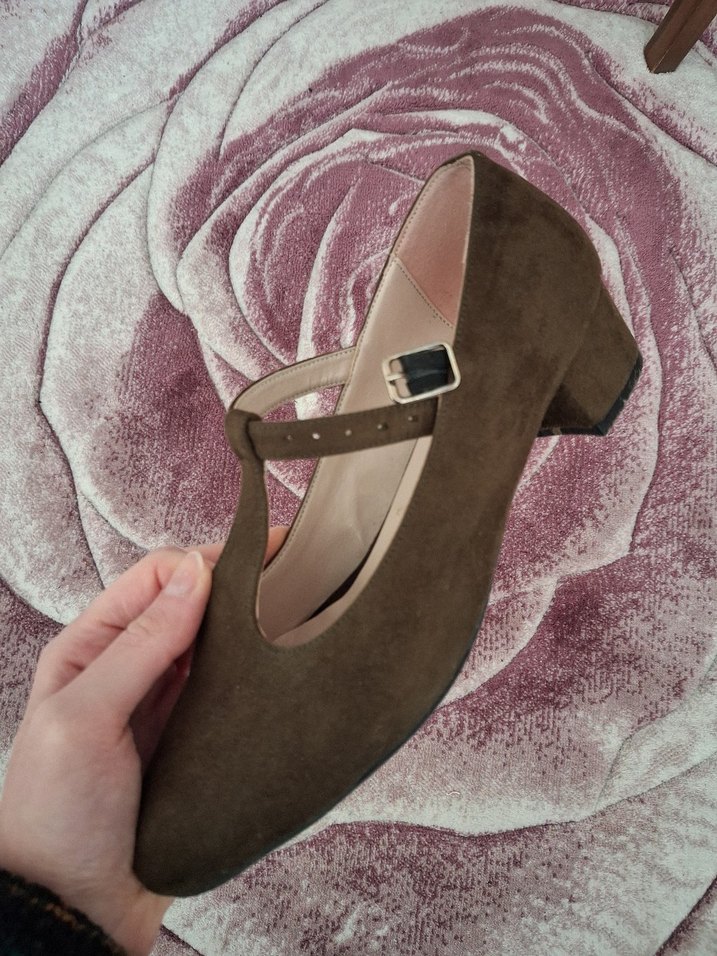 süet malzemeden yapılmış, tokalı ve kalın topuklu kadın ayakkabısı. Günlük kullanıma uygun sade ve klasik tasarım.
