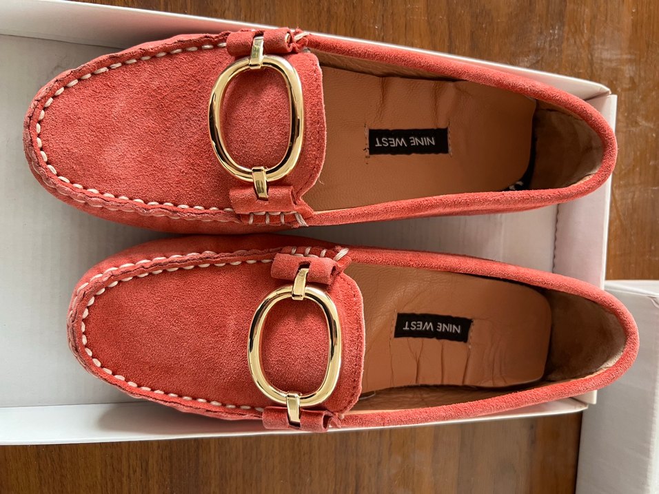 Nine west marka mercan renk, süet loafer, parlak altın sarısı tokalı, nakış detaylı, bohem tarzda şık bir modeldir.