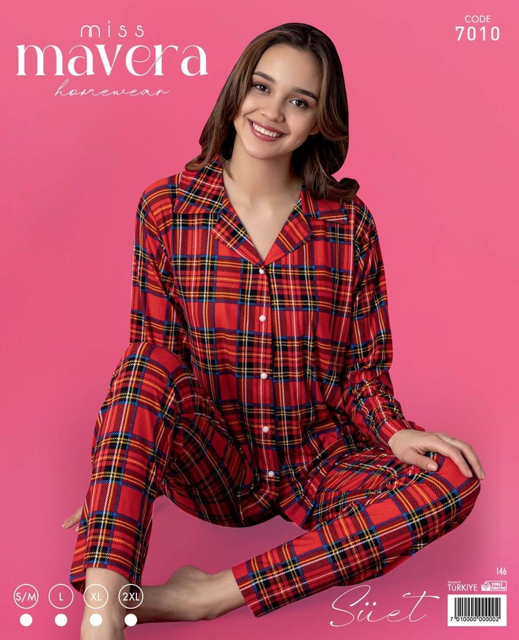 Miss Navera markasına ait, rahat kesim, uzun kollu, renkli kırmızı ekose desenli kadın pijaması. Yumuşak ve konforlu kumaştan üretilmiştir.