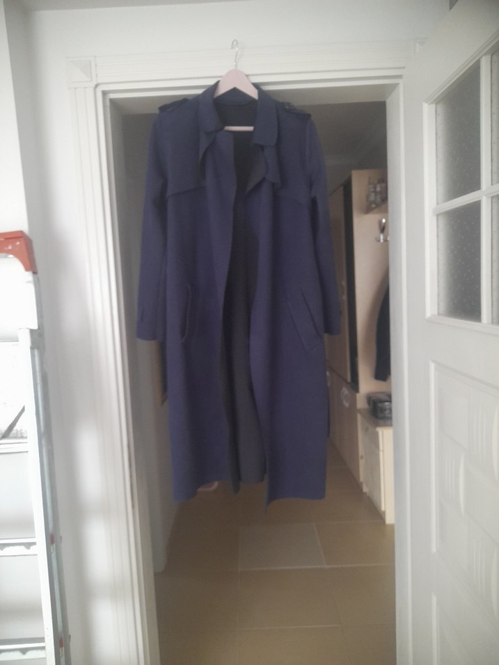 Süet uzun, lacivert kadın trençkot, kesik yaka ve uzun kolludur. Normal kesim ve dökümlü tasarıma sahip, yumuşak ve sıcak kumaştan üretilmiştir. ️defosu yoktur