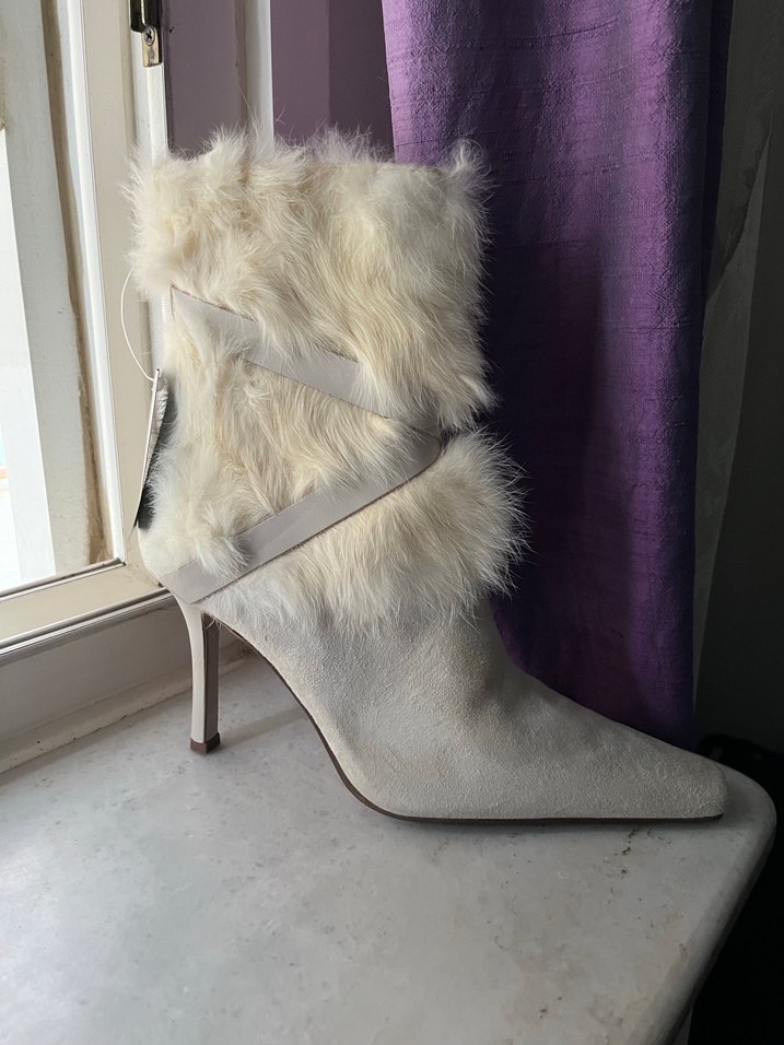 Nine West tavşan kürklü süet topuklu bot. Hic giyilmedi, etiketli ve deformasyon yok. Şık davet ve özel günler için ideal. Ekru ve beyaz kurk