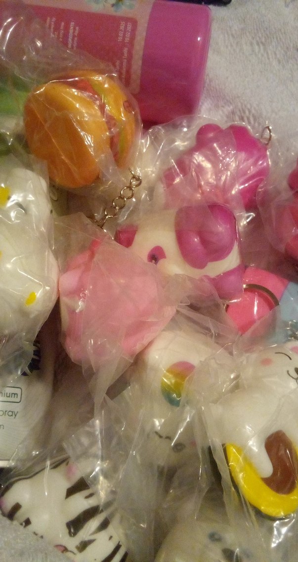 Çeşitli şekillerde, plastikle tek tek paketlenmiş renkli pembe oyuncak anahtarlıklar. Canlı renkler ve eğlenceli tasarımlar içerir.
