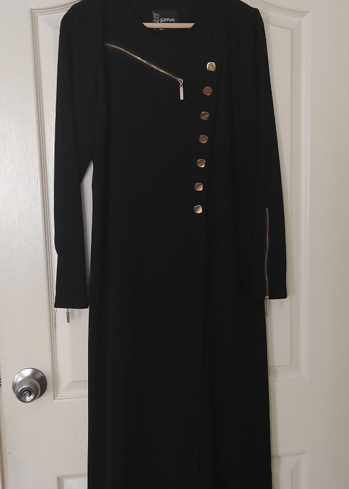 Az kullanılmıştır. Ön etek açılmasın diye çıtçıt dikmiştir, dikişler temizdir. Son fotoğrafta daire içine alınan yerler kancalı iğne izidir. Başka özürü defosu yoktur. L/M uyumlu. Omuzdan boy uzunluğu 135 cm.