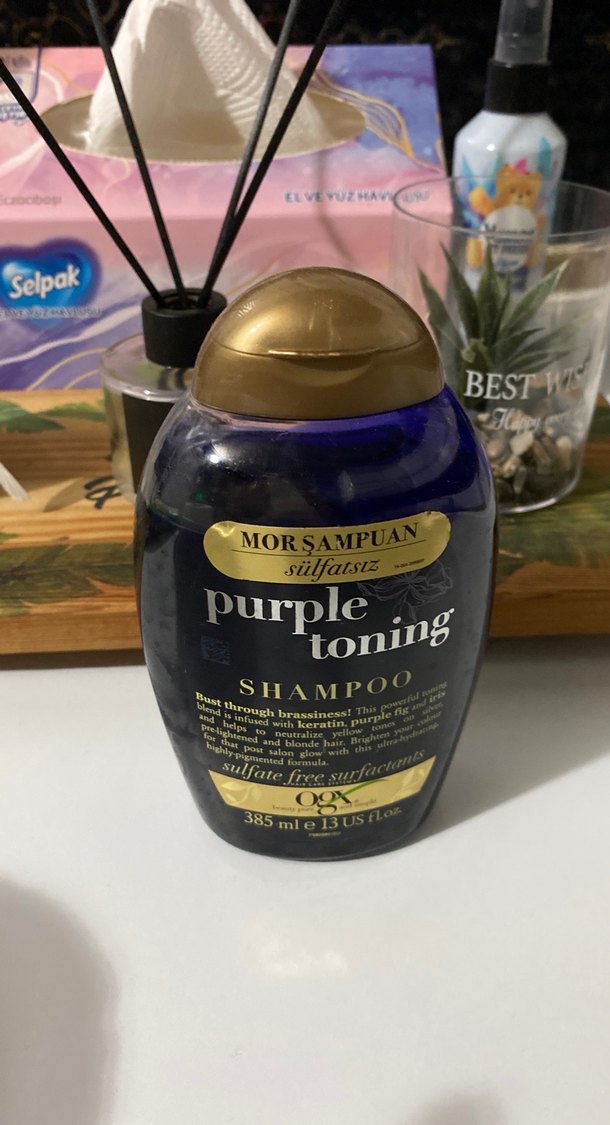 385ml sülfatsız mor tonlama şampuanı, keratinle saçları besler, sarı tonları nötralize eder ve nazikçe temizler. İki kere kullanıldı