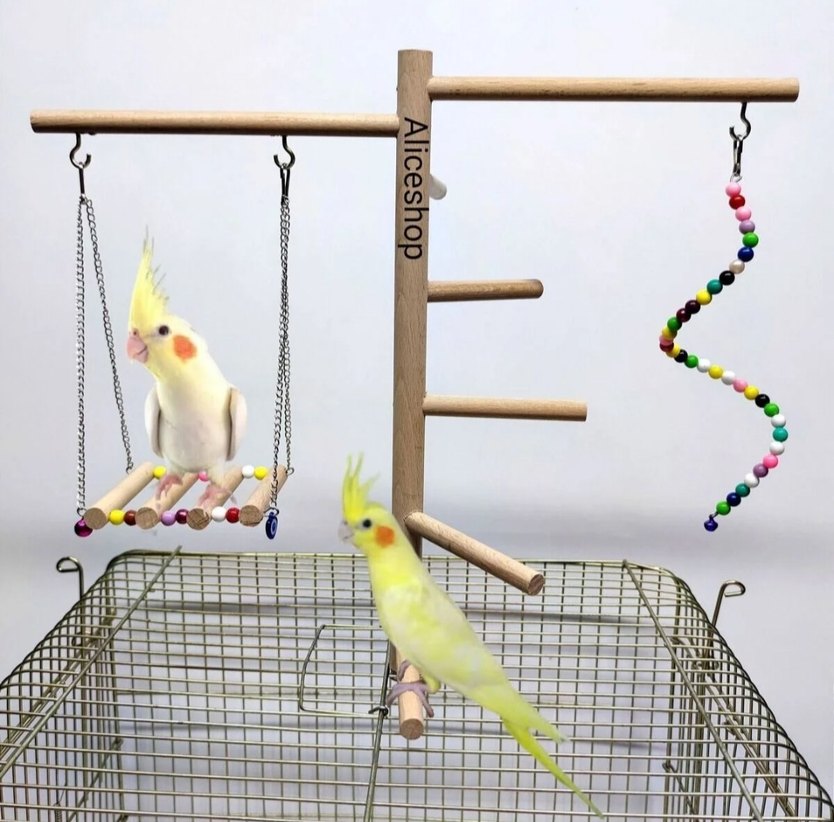 Renkli boncuklu ahşap kuş salıncağı ve tırmanma oyuncağı, küçük evcil kuşlar için eğlenceli bir aktivite alanı oluşturur. Sultan Papağanı ve boyutlarındaki kuşlar için uygundur