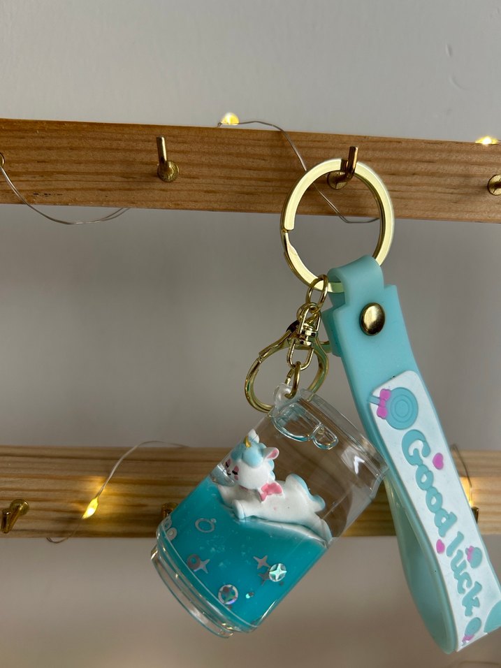 Pastel mavi renkte tokalı, içinde yüzen unicorn figürlü şeffaf aksesuarı olan bohem ve retro tarzda rahat bir anahtarlık.