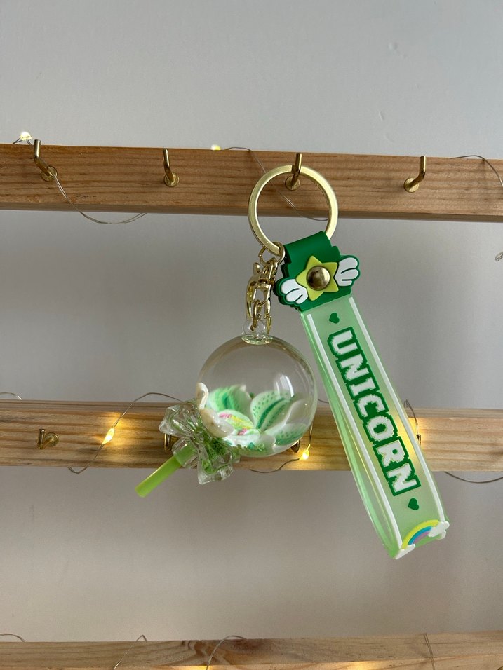 Yeşil anahtarlık, üzerinde 'UNICORN' yazılı renkli kurdele ve dekoratif küçük küre figürü içerir, bohem tarz için uygun.