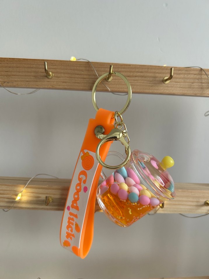Renkli boncuklarla süslenmiş, turuncu 'Good luck' yazılı kayış ve şeffaf kavanozlu retro tarz anahtarlık.