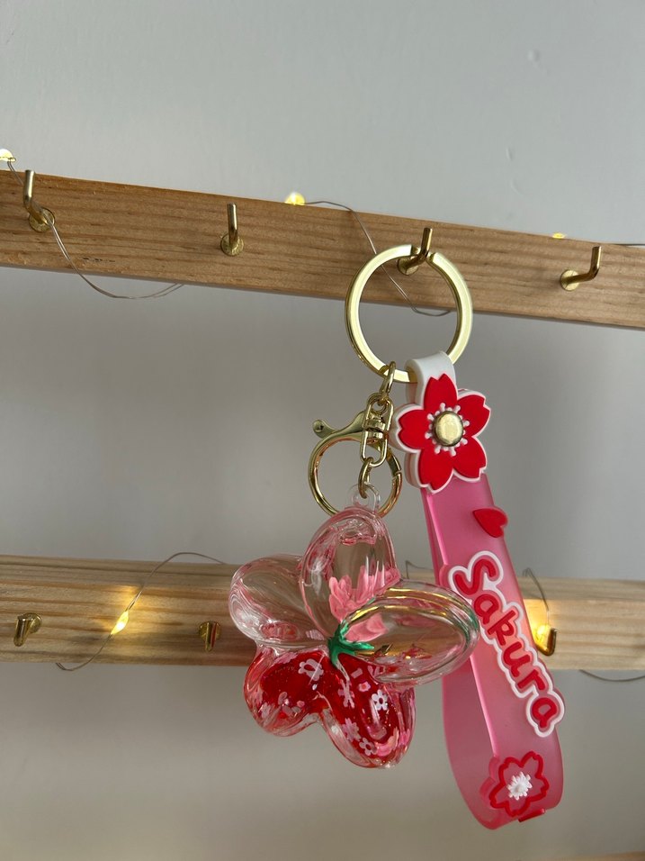 Renkli zincir detaylı, şeffaf çiçek ve 'Sakura' yazılı pembe etiketli anahtarlık. Minimalist ve retro tarzıyla uyumlu.