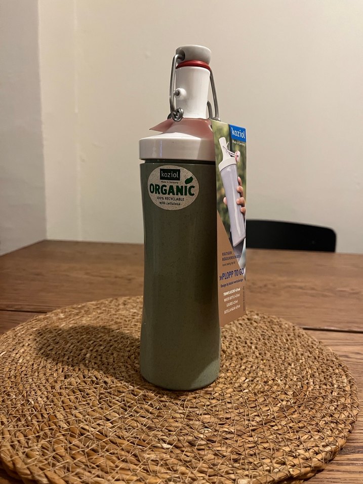 Organik plastik malzemeden yapılmış, hali yeşil renkli su şişesi, emniyet kapaklı ve taşıma kolaylığı için karabina klipslidir. Ünlü alman markası koziol markadır