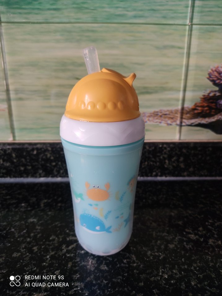 Pastel mavi renkte, yumuşak sarı kapaklı ve deniz hayvanları desenli cocuk suluk.ufak tefek çizikler mevcuttur.resimlerde gördüğünüz gibi.marka temsilidir