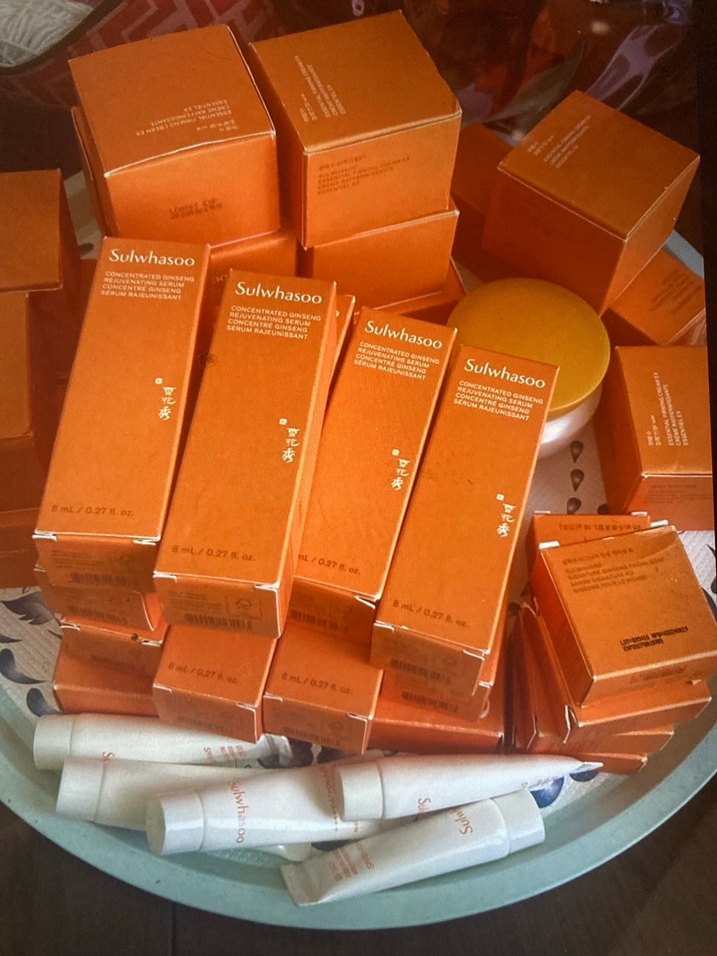 Turuncu kutularda Sulwhasoo marka yer almaktadır. Şık ve düzenli paketlenmiş ürünlerdir. Sabun yüz temizleme yağı maske krem ve serumdan oluşmaktadır.hepsi orjinal sıfır Ürünlerdir her üründen 9 ar adet mevcuttur tekli olarak sayfamda bulunmaktadır .