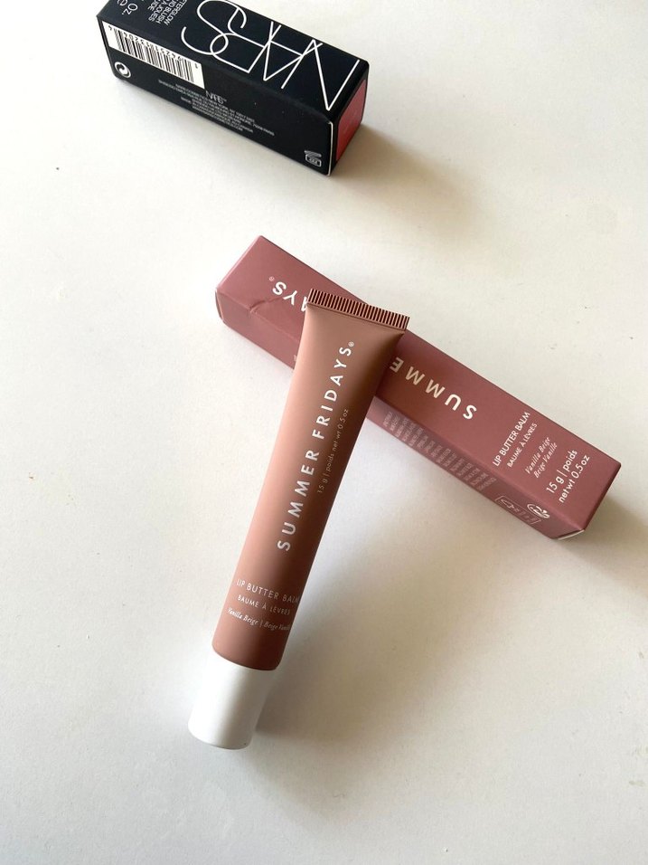 Summer Fridays dudak parlatıcısı, pastel bej tonunda, doğal görünüm için yumuşak ve parlak bir doku sunar.