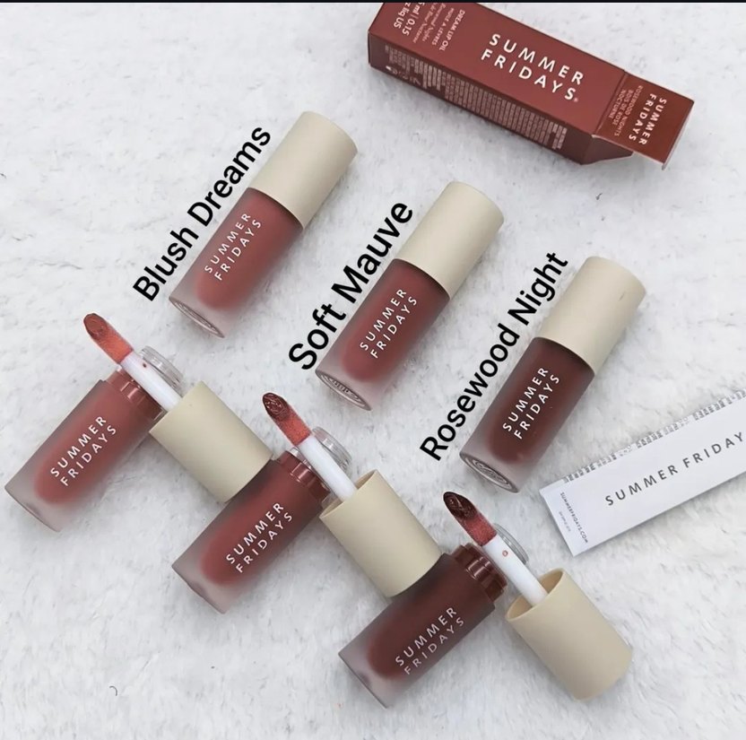 Summer Fridays dudak parlatıcısı, pastel bej tonlarında, pürüzsüz ve parlak bir bitiş sağlar. Blush Dreams, Soft Mauve ve Rosewood Night renkleri mevcuttur.