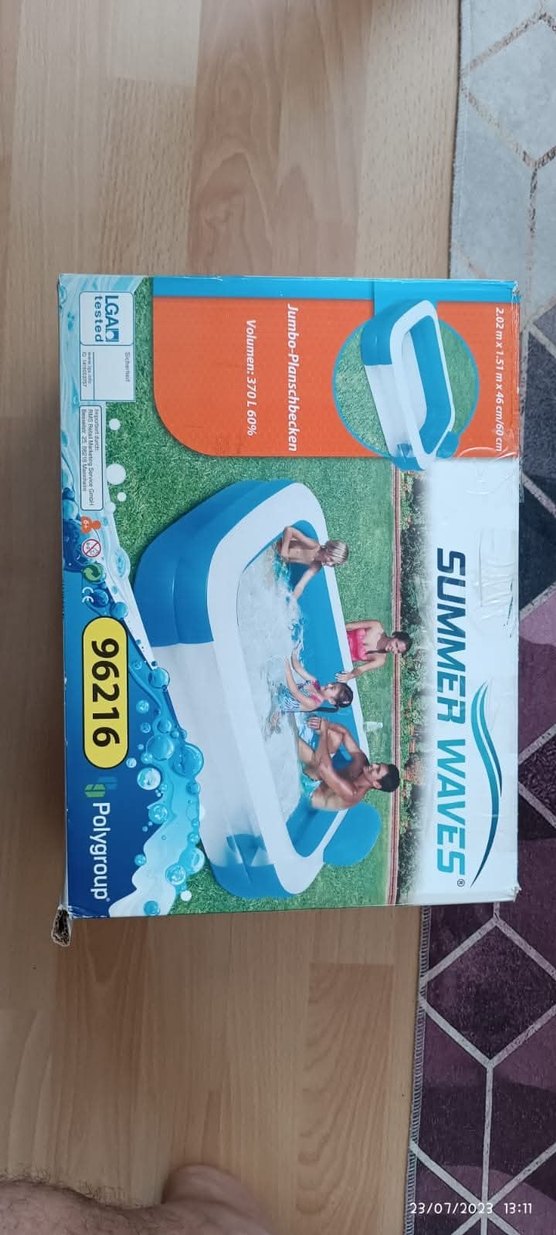 Summer Waves büyük şişme havuz, çocukların su oyunları için geniş alan sağlar. Açık mavi renkte olup, 220x151x46 cm ölçülerindedir. Ürün Güvenliği Bu ürün belirli ek güvenlik uyarılarına tabidir Uyarı:36 aydan küçük çocuklar için uygun değildir Marka BESTWAY RenkMavi Ürün Boyutları UxGxY3.05 x 1.83 x 0.46 metre ŞekilYuvarlak MalzemePolyester Kapasite850 Liters Ki kilitli hızlı hava tahliye vanası bulunur 2 eşit halka dan oluşu Kolay tahliye vanası ile havuz suyunu boşaltma kolaylığı Aile Havuzu Ölçü ; *Uzunluk : 305 cm *Genişlik : 183 cm *Yükseklik : 46 cm *Renk : Mavi * İki kilitli hızlı hava tahliye vanası bulunur * Sağlam önceden test edilmiş vinil malzemeden üretilmiştir * 2 eşit halka dan oluşur * Ekstra geniş yan duvarları mevcut * Tasarlanmış su kapasitesi: 850 L *Kolay tahliye vanası ile havuz suyunu boşaltma kolaylığı * İçerisinde şişirme pompası bulunmamaktadır. * Kutu ağırlığı : 8 kg Yeni Hiç Kullanılmamıştır kutusunda