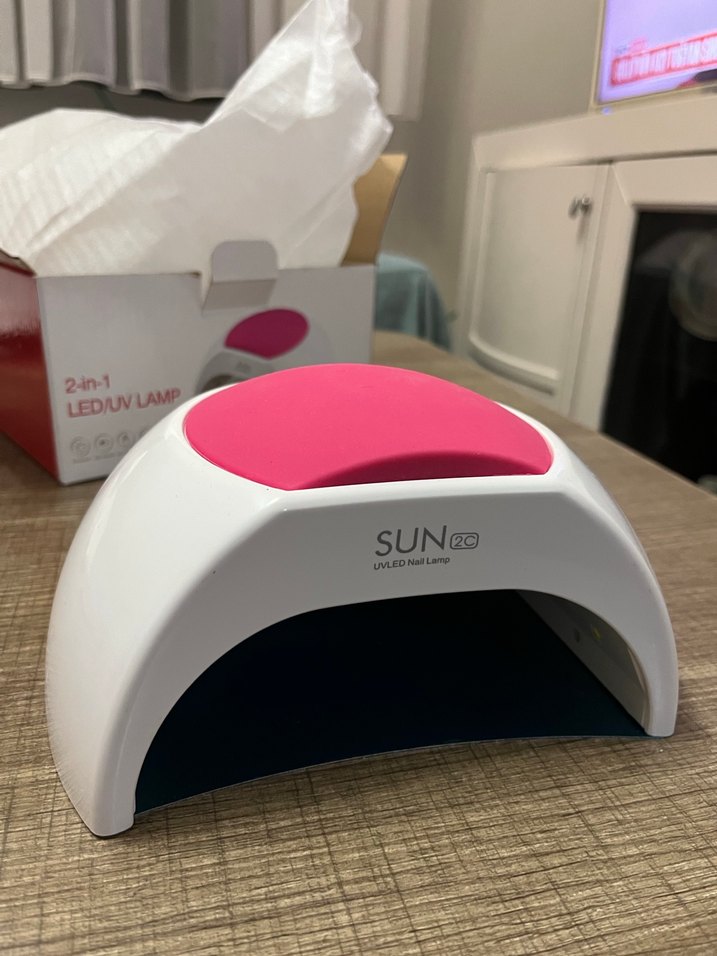 Pembe renkte SUN marka 2'si 1 arada LED/UV lamba, jel tırnaklar için çift ışık kaynağı sunar. Kompakt ve kullanımı kolay.