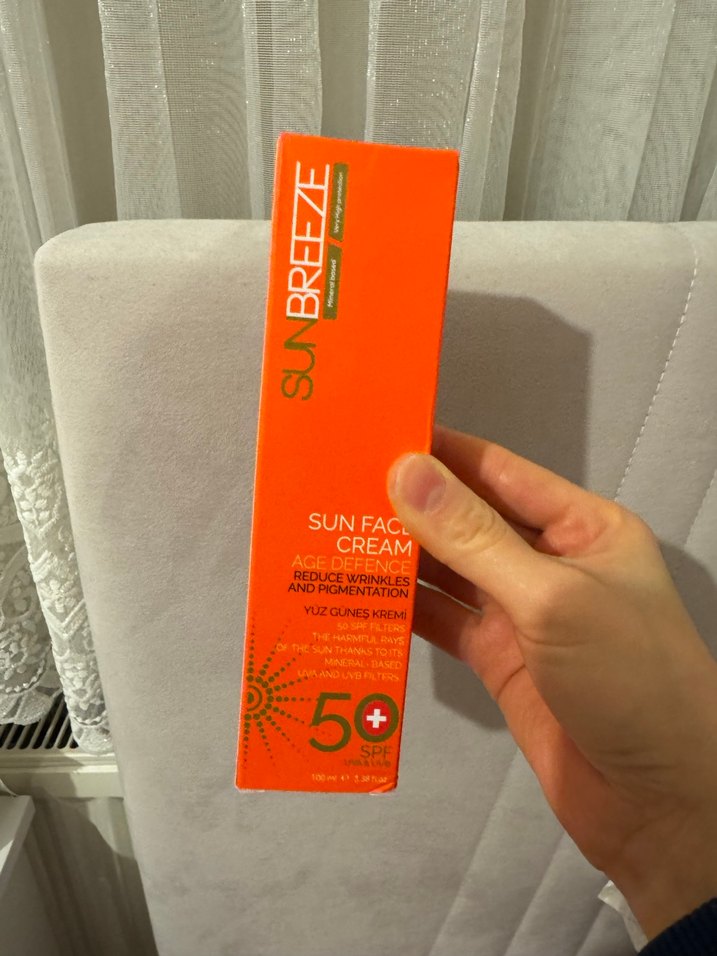 Sun Breeze yüz kremi SPF 50+ koruma sağlar, kırışıklıkları ve pigmentasyonu azaltmaya yardımcı olur ve cildinizi güneşten korur.