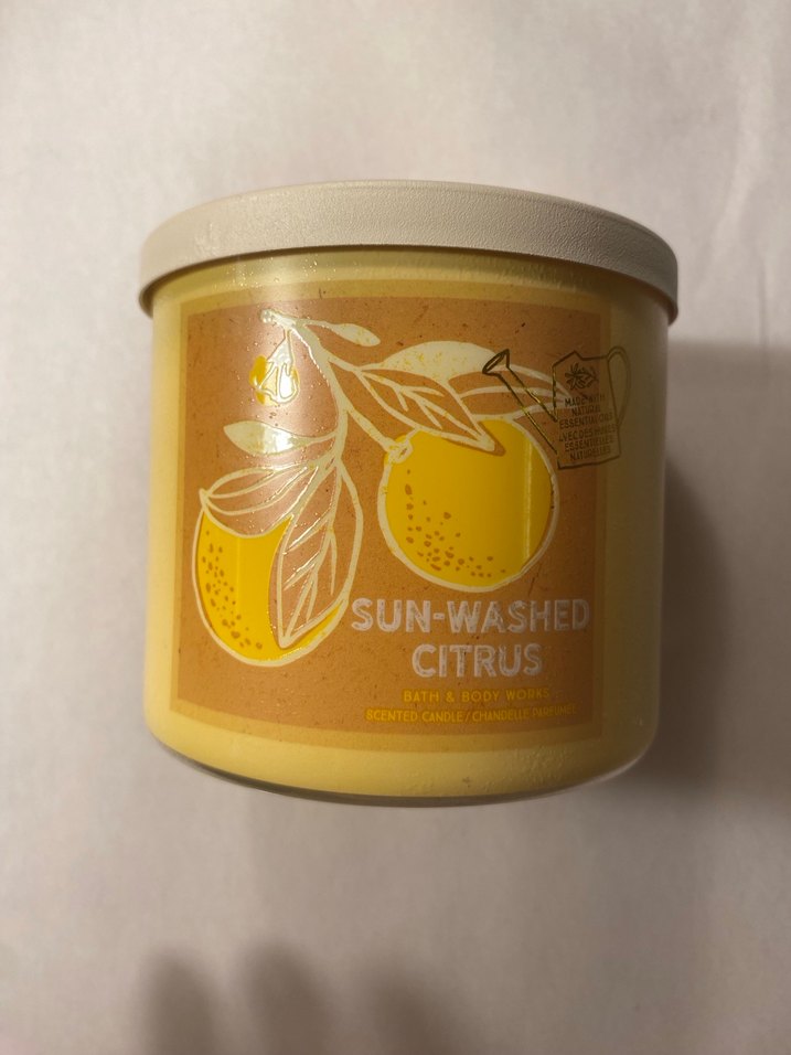 Parlak sarı renkte, 'Sun-Washed Citrus' kokusuna sahip mum. Beyaz kapaklı, üzerinde narenciye desenleri bulunan sade bir kutuda.