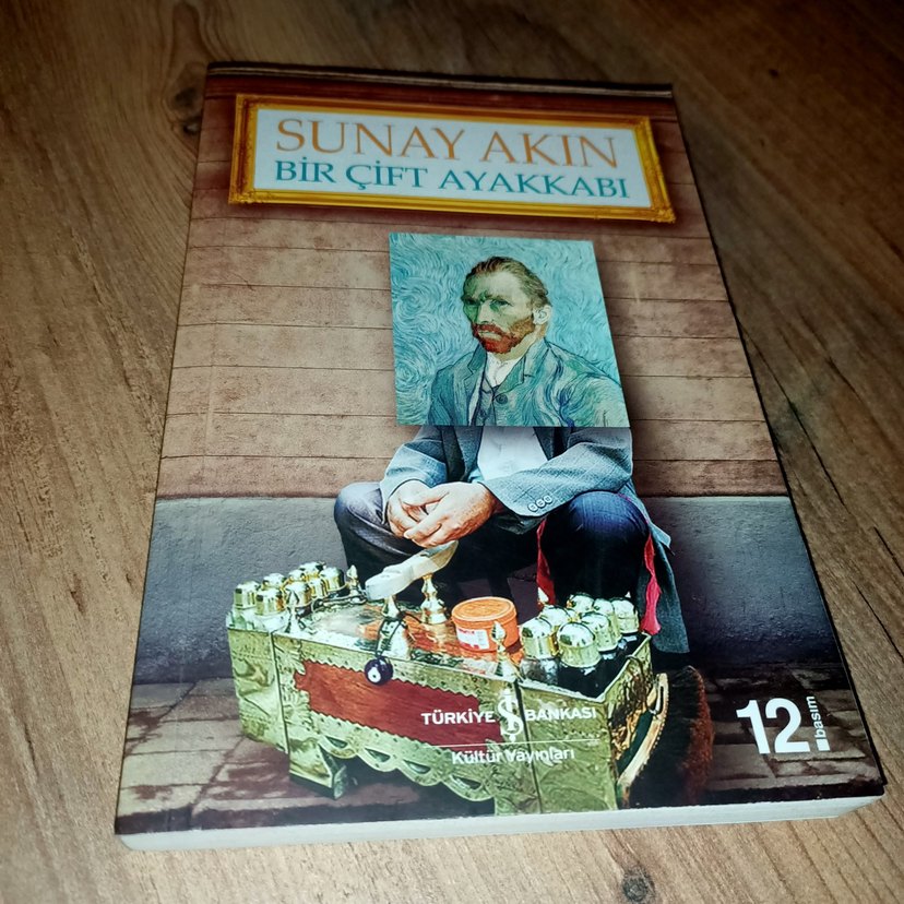 Sunay Akın'ın "Bir Çift Ayakkabı" kitabı, sanat ve hikaye anlatımıyla temaları işler, kapakta portre ve ayakkabı boyacısı sahnesi yer alır.