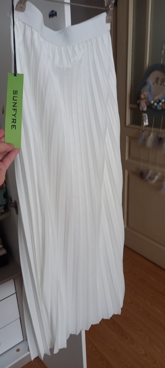 SUNFYRE marka, sentetik kumaştan yapılmış, beyaz renkli pilili uzun etek. Minimalist tarzda, günlük kullanıma uygun, regular fit kesim.