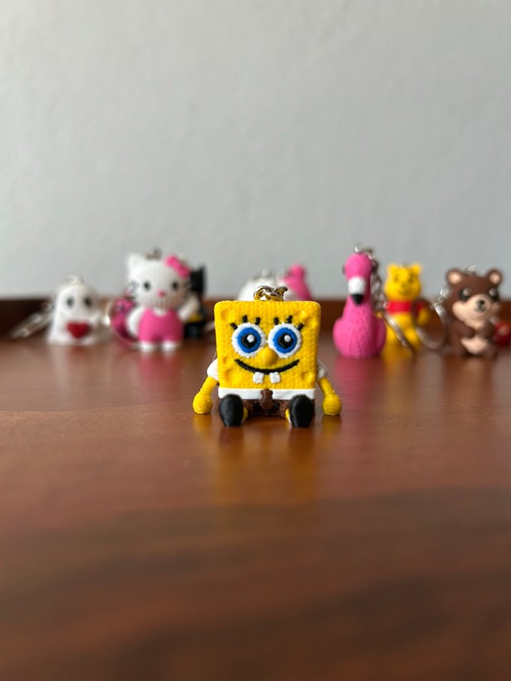 Detaylı yüz ifadeleri ve kıyafeti olan renkli sarı Sünger Bob anahtarlık figürü. Diğer minik karakter oyuncaklar arasında öne çıkıyor. ️