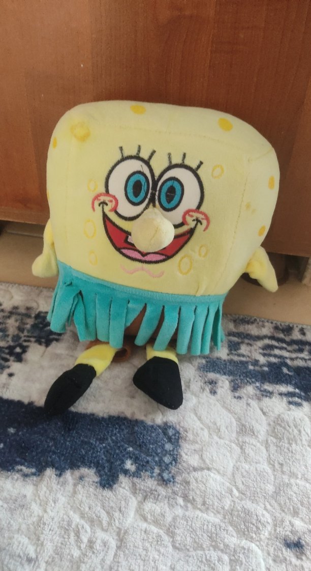 Yumuşak sarı Sünger Bob peluş oyuncak, mavi gözlü ve püsküllü etek detaylı. Pastel renkli karakter peluşu.