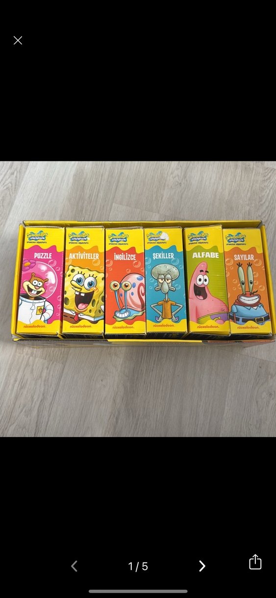 SüngerBob temalı çocuk kitapları seti; puzzle, aktiviteler, İngilizce, şekiller, alfabe ve sayılar içerir. Konuşan kalemi var dairelere kalemle dokununca sesli bir şekilde söylüyor