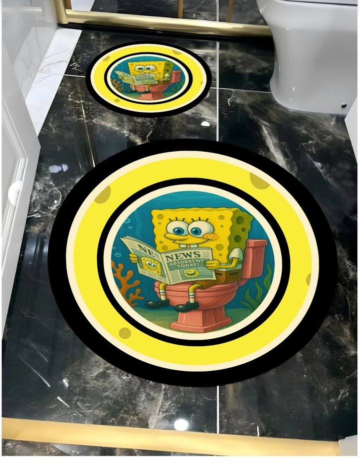 SüngerBob temalı, sarı bordürlü renkli banyo paspası. Canlı ve eğlenceli tasarım banyo için uygundur.