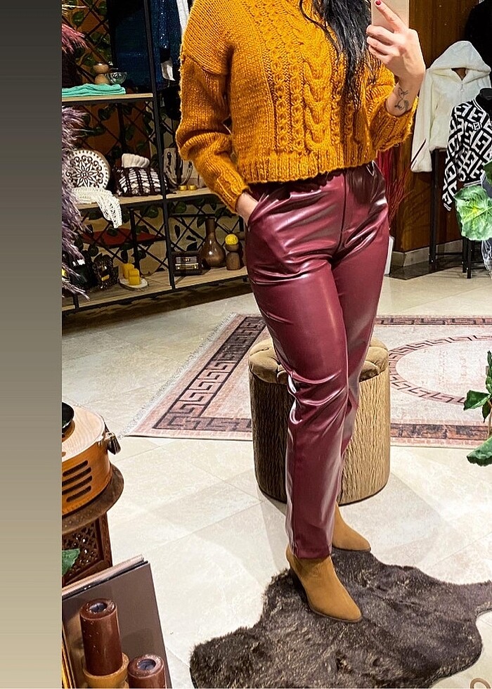 Bordo renk suni deri cigarette model pantolon sıfır ürün, çok az esneme payı var çıtçıtlı düğmesi var uygun bir kemerle klasik ve spor tüm kombinleriniz mükemmel olur, iki adet kaldı M ve L beden