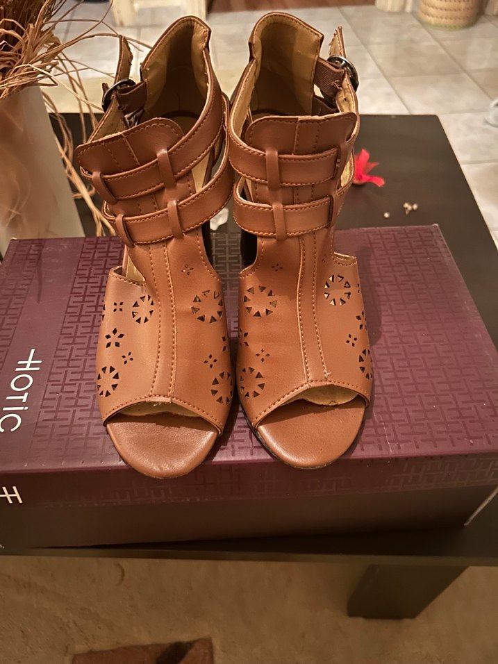 Taba renk suni deri topuklu sandalet, tokalı kayışlar ve desenli kesim detaylarıyla bohem tarzda romantik akşamlar için uygun. ✨topuk boyu 7 cm’dir.