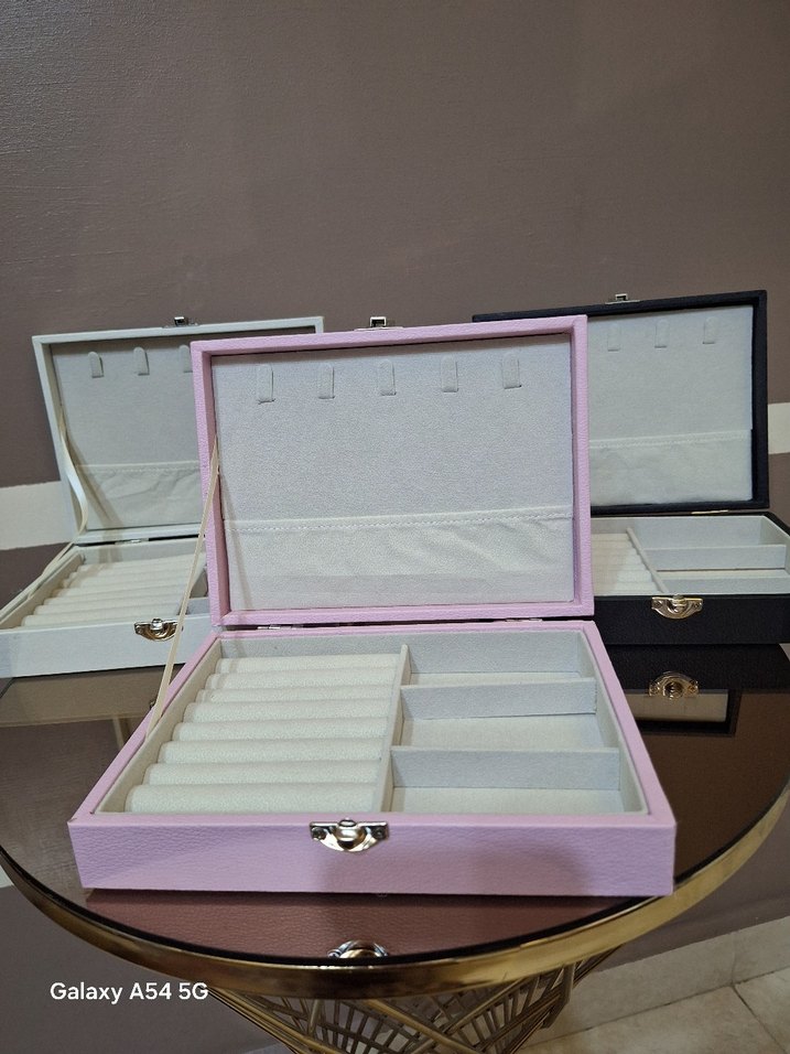 SIFIR KUTULU DERI TAKI KUTULARI. SAYFAMDA AYNI MODELIN KADIFE MODELI DE MEVCUTTURPastel pembe makyaj ve takı kutusu, çeşitli bölmelerle aksesuarlarınızı düzenler. Güvenli kilit ve yumuşak iç yüzeye sahiptir.