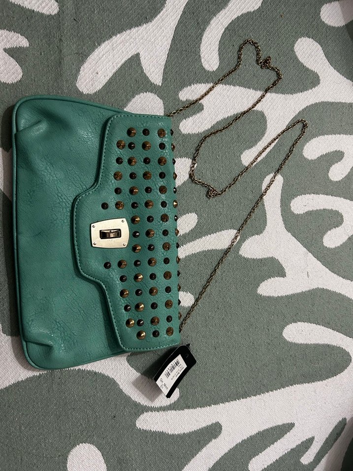 Koyu turkuaz renkte, desenli, tokalı ve metal çıtçıtlı suni deri çanta. Zincir askısı ile günlük sokak stiline uygun. Hiç kullanılmadı yurtdışından geldi